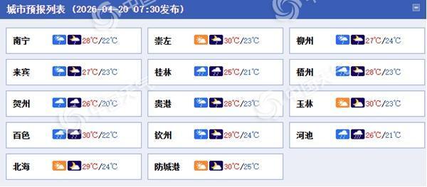 中国天气网讯 未来三天(4月20至22日),广西降雨依然广泛,其中今天桂林、柳州等地局地有暴雨,还伴有雷暴大风、冰雹等强对流天气,公众外出需尽量避开午后强对流易发时段出行。
